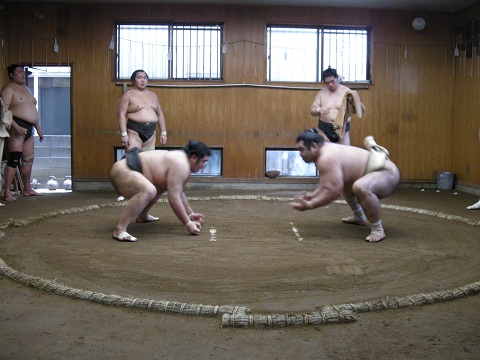 平成24年9月3日(月)AM7:15 JR両国駅西口に12名(杉並句支部8名、大田区支部4名)が集合。 徒歩13分くらいで片男波部屋に到着。すでに朝稽古は始まっており各力士が20kgの水の入ったポリ容器を抱えスクワットの最中であった。土俵には8人の力士がおり2組に分かれていた。そのほかに最近引退した元玉乃島関が部屋付き親方として指導に当たっていた。2百回ほどのスクワットのほかジャンプ運動の後、ぶつかり稽古。最初は、序二段同士だったが次、三段目・幕下と、最後に先場所幕内で今場所重量4枚目に下がった玉飛鳥関がやっていた。その間、片男波親方の厳しい指導が入る。玉鷲関は腰の調整のため稽古はぶつかり稽古は休んでいた。ぶつかり稽古の運動量の多さ・激しさは、何番もやっていると力士の目が空ろになり大きい激しい呼吸になるのでわかる。2時間半の稽古が終わり、10時半ころより、食事になった。食事しながら片男波親方にいろいろな質問が飛ぶ。親方の指導方針は、力士は、普段、片時も相撲を離れることなく絶えず頭の中で考え稽古し、本場所になったら一切考えない。そして、普段、苦しい稽古の中で自分を追い込み追い込み、最後に体に覚えさせ本能で相撲をとれるようににするというものであります。12人皆、頷き、親方の奥さんと力士達の作ったチャンコと他の料理に舌づつみをうち、記念写真を部屋の前で撮り、楽しい朝稽古見学・チャンコを囲む会を終了しました。 記安西